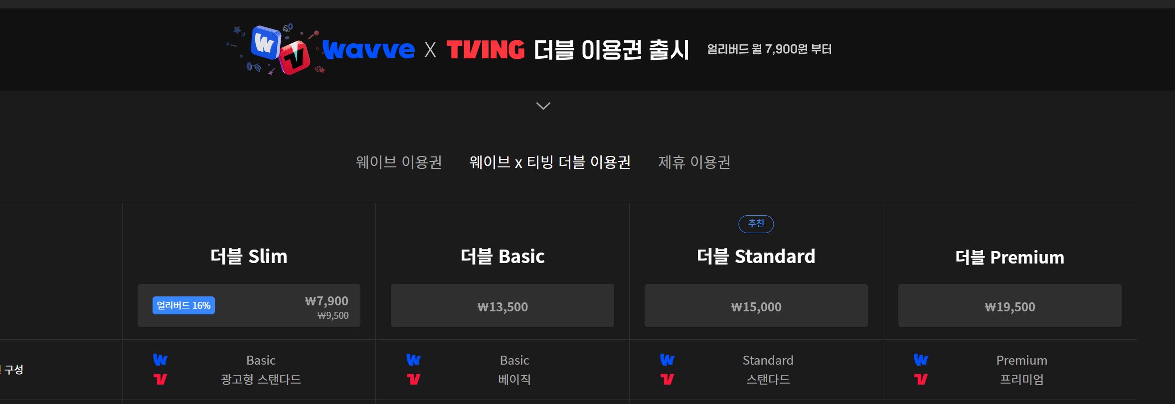 - 티빙과 웨이브를 동시에 이용할 수 있는 통합 요금제입니다.