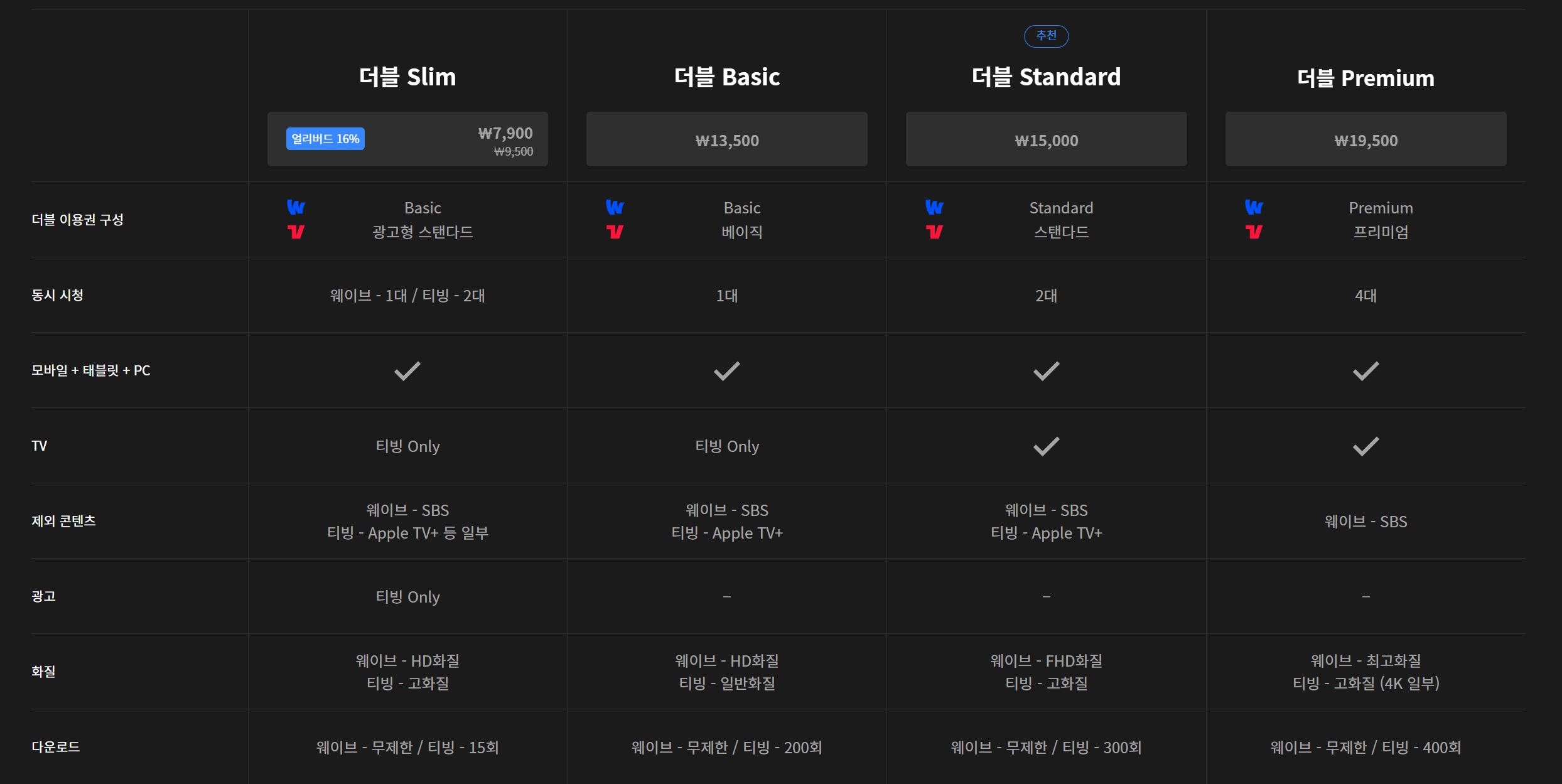 티빙·웨이브 더블 이용권은 각 요금제별 콘텐츠 수준에 따라 구독량을 조절할 수 있어 합리적인 선택입니다.