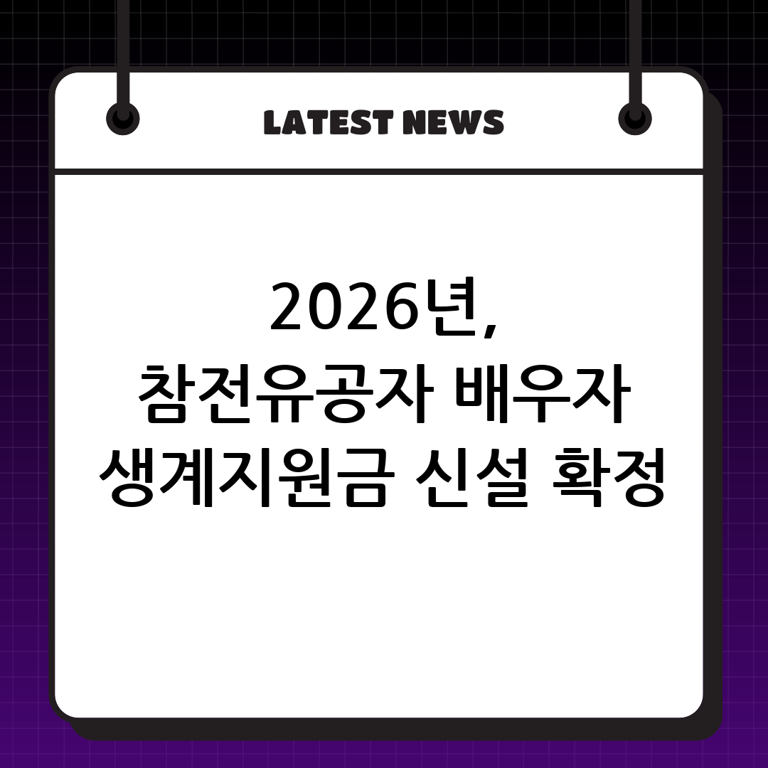- 참전유공자 배우자 생계지원금 신설: 참전유공자 사망 후 생계에 어려움을 겪는 배우자에게 월 10만 원의 생계지원금을 지급합니다. 약 15,800여 명이 혜택을 받을 것으로 예상됩니다.